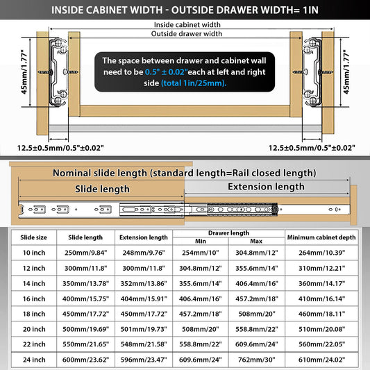 YENUO 1 Pair Full Extension Drawer Slides Side Mount 10 12 14 16 18 20 22 24 Inch Ball Bearing Metal Black Rails Track Guide Glides Runners Heavy Duty 100 Pound Load Capacity Black