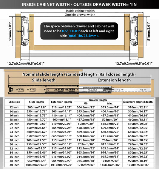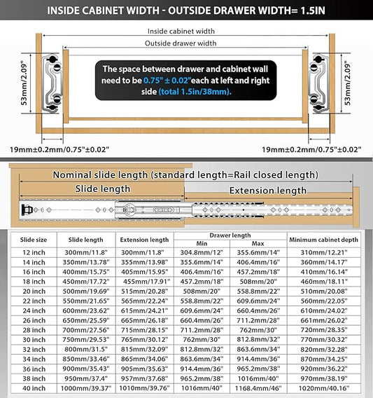 YENUO Heavy Duty Drawer Slides 12 14 16 18 20 22 24 26 28 30 32 34 36 38 40 44 48 52 56 60 62 64 66 68 70 72 74 76 78 80 Inch Full Extension Side Mount Ball Bearing Long Rails Track Guide Glides Runners Load 500 Lbs 1 Pair(No lock)
