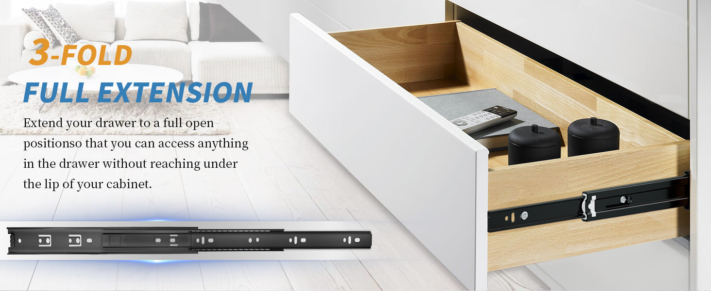 - 【3-Fold full extension & Detachable 】“The 3-fold full extension”enable the slides to fully extend, which designed to extend your drawer to a full open position so that you can access anything in the drawer without reaching under the lip of your cabinet; Detachable:There is a plastic buckle on the back of the slide rail, by pressing it,the 3rdtrack(the narrowest section) can be separated ,which means the drawer can be installed and detached easily by your will;