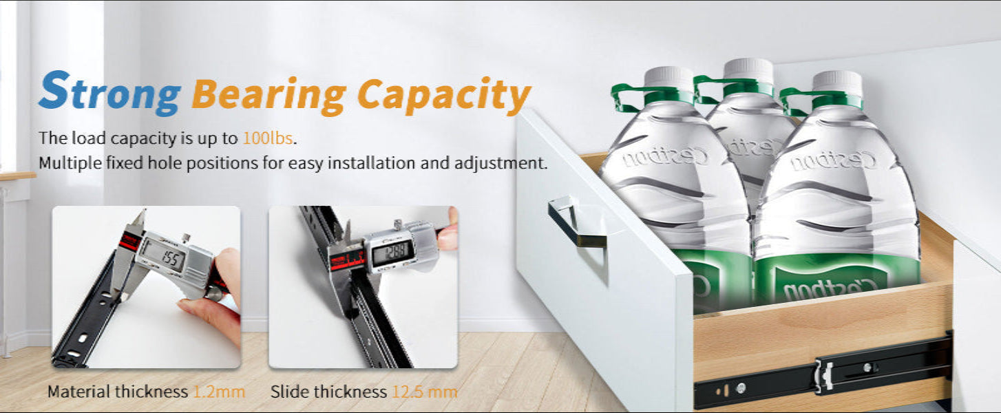 - 【MAXIMUM LOAD CAPACITY: 100lb 】 The slides is made of 1.5mm High - density cold-rolled steel plates,it will keep your drawers stable and safe even carrying up to 100 lb heavy weight items,which take 100,000 times of push-pull tests full loaded without damage,the service life of the slide rail could be 30 years at least.