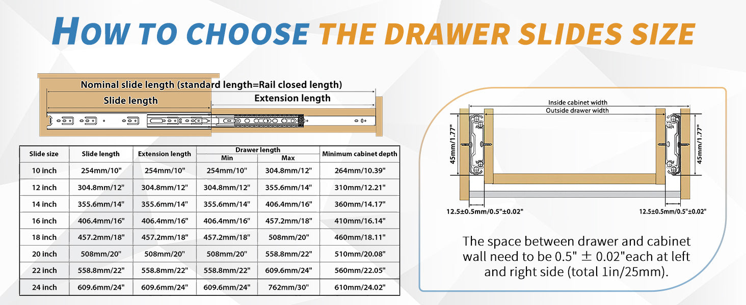- 【Installation note】Slide length:12"(307mm)--Fully extended length:24"(609mm).Quantity: 1 pair(2 pieces)一Suitable for drawers with an internal depth of ≥ 12"-14".The space between drawer and cabinet wall need to be 0.5in each at left and right side,total 1in ( inside cabinet width - outside drawer width= 1in ),Mounting screws included. Installation tutorials and instructions are included.