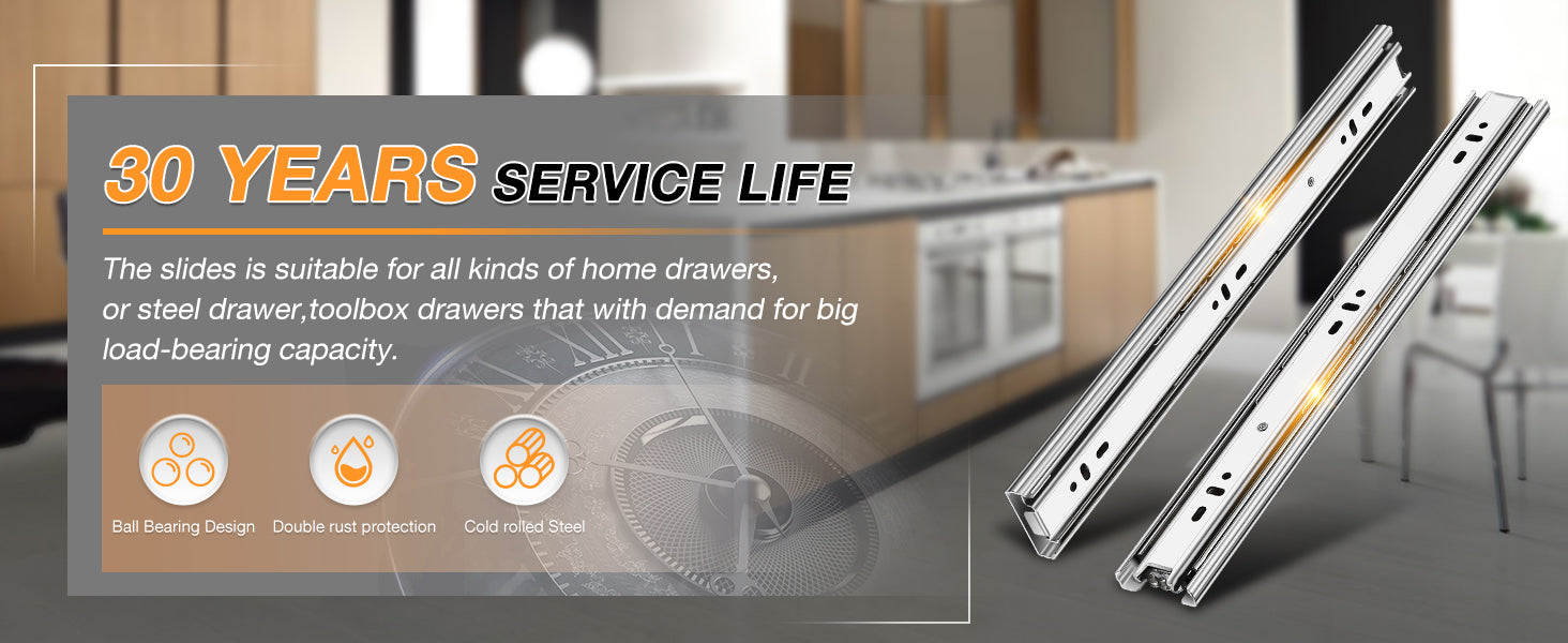 - 【High quality,30 years service life】The drawer slide is made of high quality stainless steel with doubled anti-rust effect. The high-density 1.2x thick steel material make the bearing capacity of slides be up to 45kg/100lb. Both of which keep our slides durable and sturdy with 30 years service life at least.