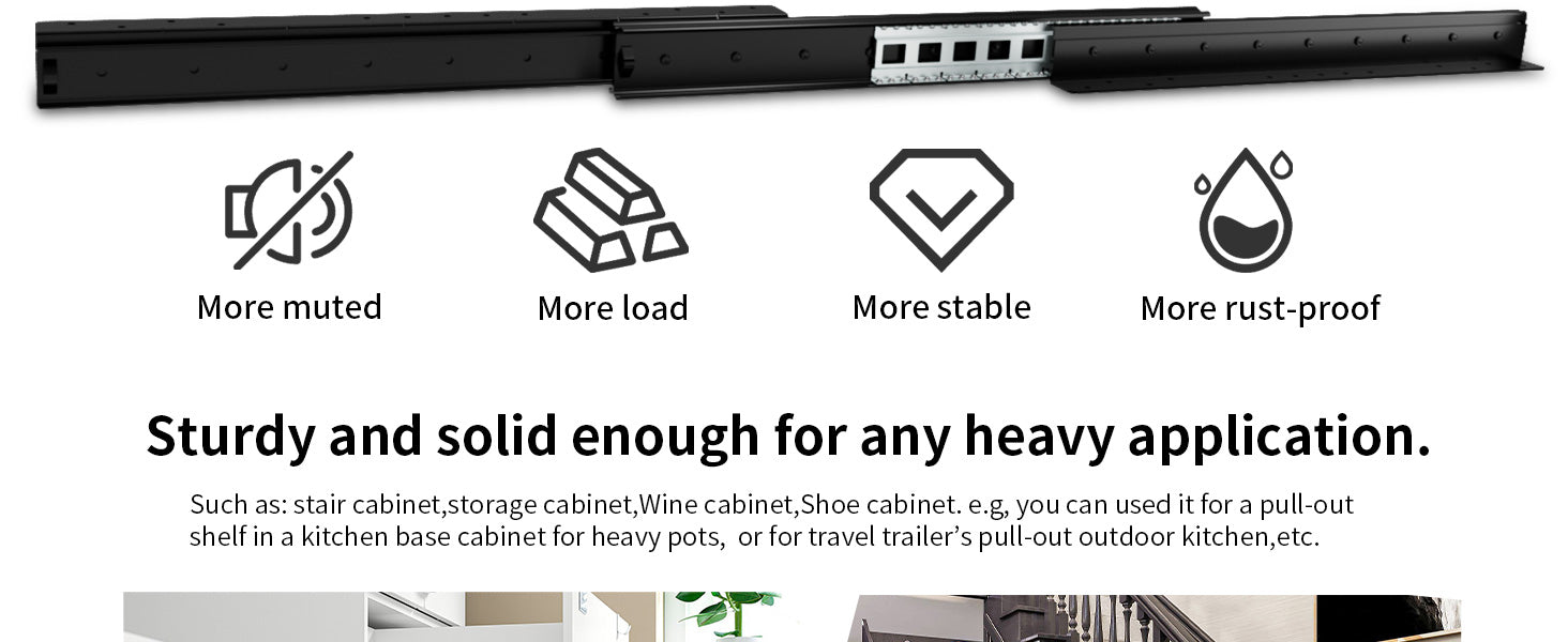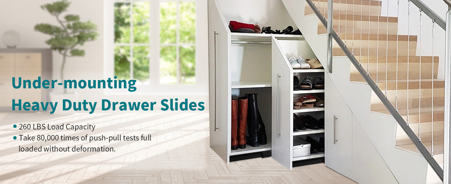 【Application】 It apply to the cupboard under stairs and any staircase cabinet, which help achieve the staircase storage space miracle.Also other heavy drawers that demanding strong bearing capacity in wine cabinet,wardrobe and so on. YENUO Hardware is a professional manufacturer specializing in the design and production of mid-to-high slide rails and hinges.Any quality or installing problem please feel free to contact us.