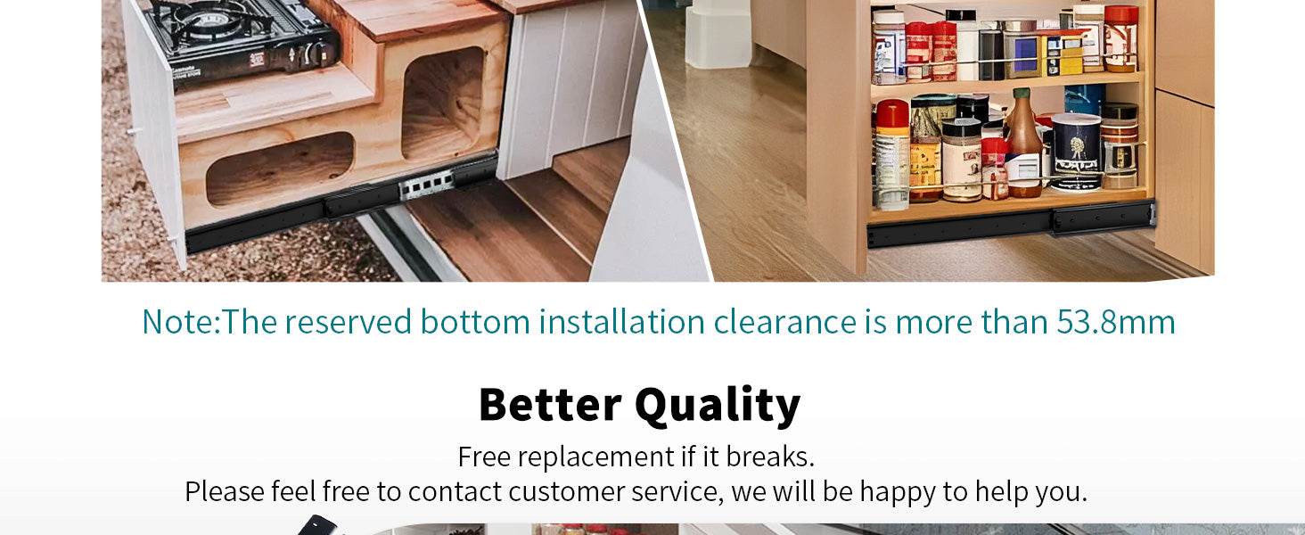 - 【Installation note】 Suitable for drawers with an internal depth of ≥ 24"-32". The slides is under mounted,there should be proper mounting clearance leaved under the drawer. Installation clearance under the drawer at least: 2.1 inch(53.8mm). Attention:One set includes a pair of slides without mounting screws included,you can purchase different M4 screws according to your specific installation scene.