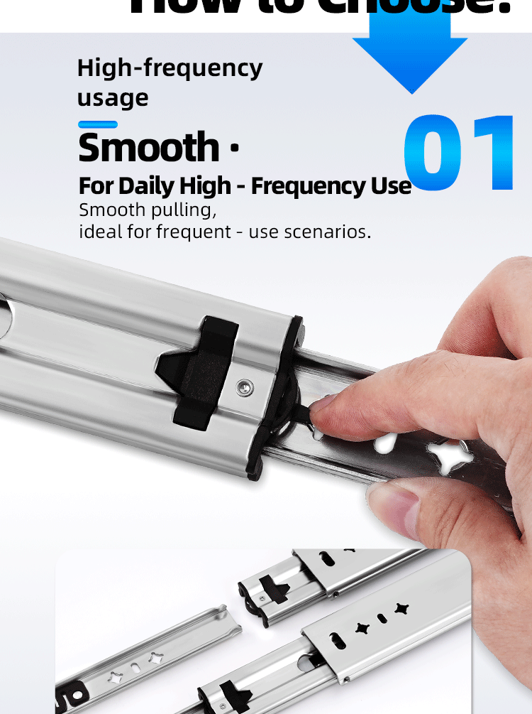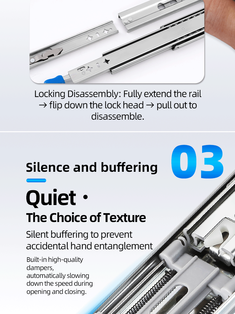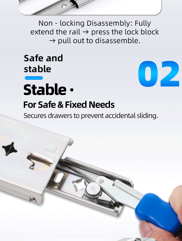 - 【Detachable】There is a plastic buckle on the back of the slide rail, by pressing it,the 3rd track(the narrowest section) can be separated ,which means the drawer can be installed and detached easily by your will; This"without lock" one doesn't have a lock handle, so it's can't be locked when it's fully closed or fully opened.You can choose the “with lock” one if needed.