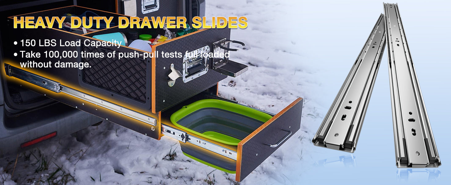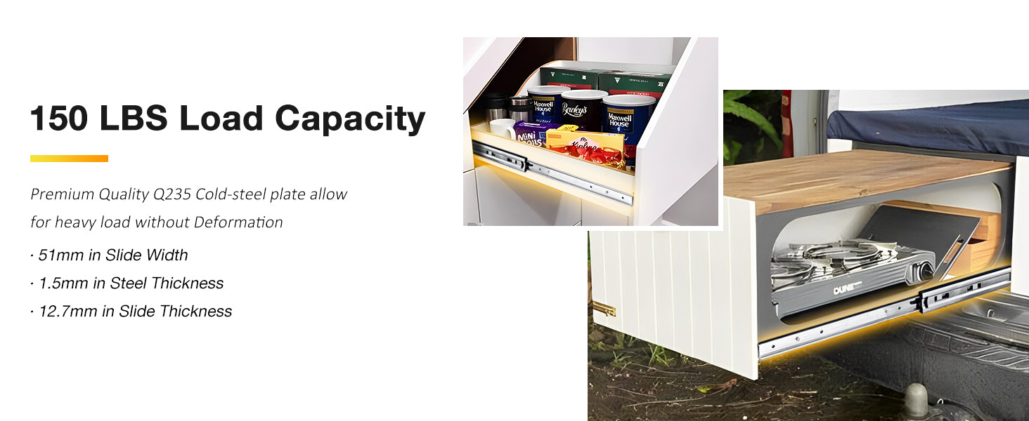 - 【MAXIMUM LOAD CAPACITY: 150 lb 】The slides is made of 1.5mm High - tension cold-rolled steel plates,it will keep your drawers stable and safe even carrying up to 150 lb heavy weight items,which take 100,000 times of push-pull tests full loaded without damage. The shorter the slide,the heavier the weight load.