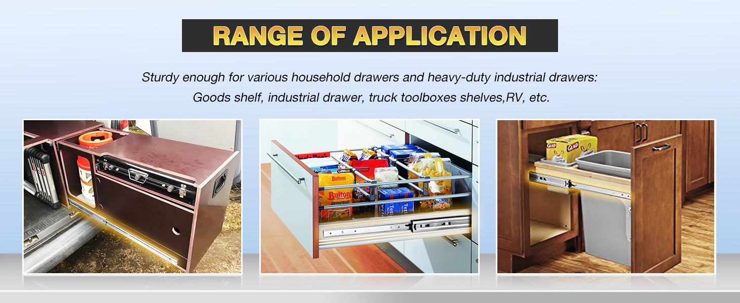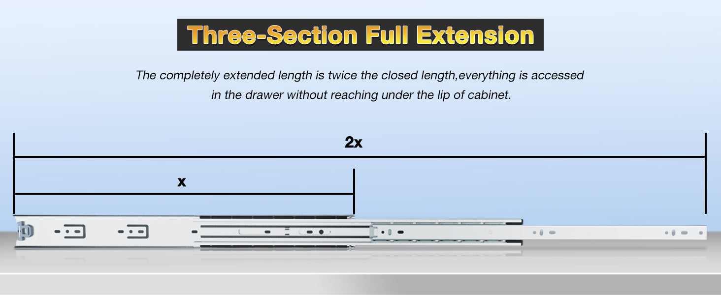 - 【3-fold full extension】 Slides width:2"(50mm)- length: 14" (350mm)--Fully extended length: 28"(700mm), “The 3-fold full extension”enable the slides to fully extend, so the drawer can be pulled out completely, which allows for the entire drawer's storage to be accessed easily; Application range:Goods shelf, Cabinets, Industry-used drawer, RV, Truck, Vending machine, etc.