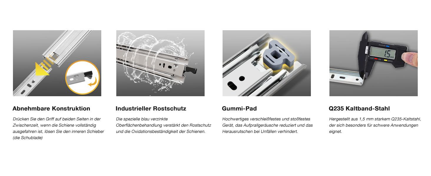 - 【Anti-rust & Smooth work 】The anti-rust ability and oxidation resistance of our slides is superior to the others because of the special galvanized blue sealing surface treatment; With dual industrial grade bearing ball inside,the drawers slide smoothly even though carrying heavy items; With a rubber crash pad on,which is a wear-resisting and impact-resistant device,the drawers can slide quietly without collision noise.