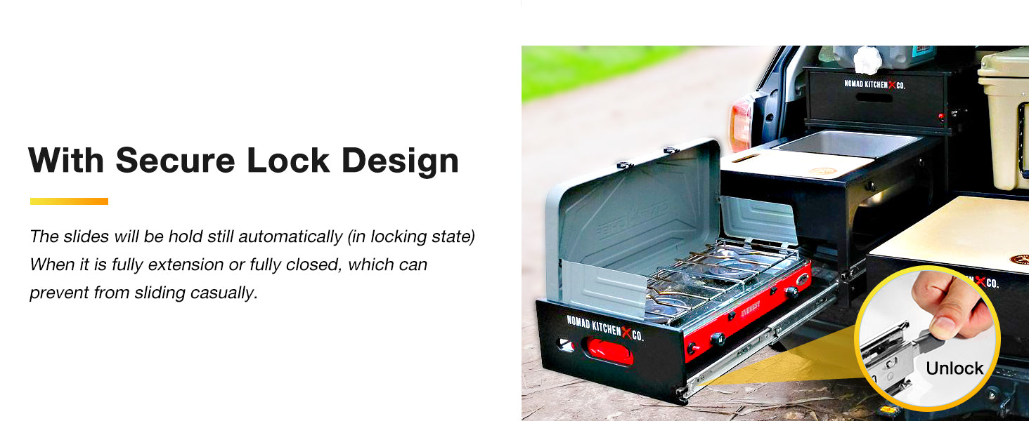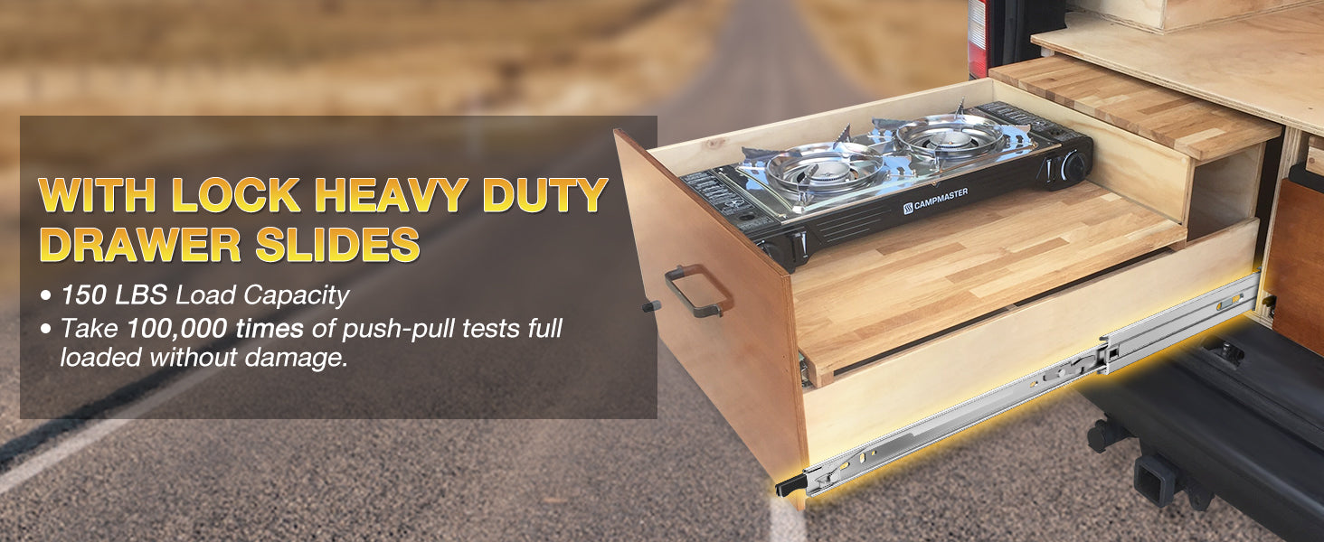 - 【With hold-still lock & Detachable】There is a black handle to lock and unlock.When it is fully extension or fully closed,the slides will be hold still automatically (in locking state),which can prevent from sliding casually and keep your drawer stable and safe.Press the lock handle gently,it's unlocked and get back in free sliding; Detachable: By press-and-hold the lock handle,and pull outward in the meantime ,the 3rd track(the narrowest section) can be separated ,easy to installl.