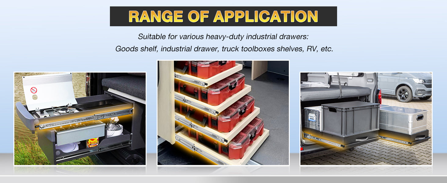 - 【3-fold full extension】 Slides width:2"(50mm)- length: 12" (300mm)--Fully extended length: 24"(610mm), “The 3-fold full extension”enable the slides to fully extend, so the drawer can be pulled out completely, which allows for the entire drawer's storage to be accessed easily; Application range:Goods shelf, Cabinets, Industry-used drawer, RV, Truck, Vending machine, etc.